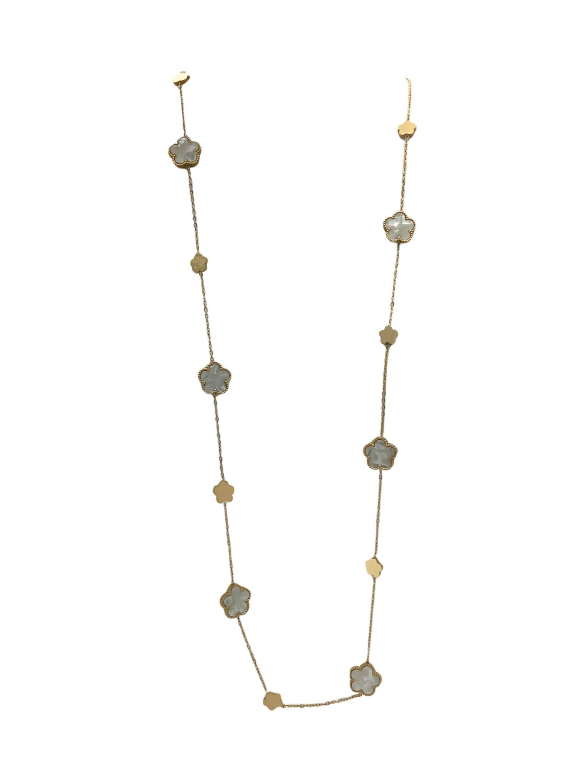 Gold-colored steel necklace with mother-of-pearl color floral pattern inserts. Ideal for any type of look.