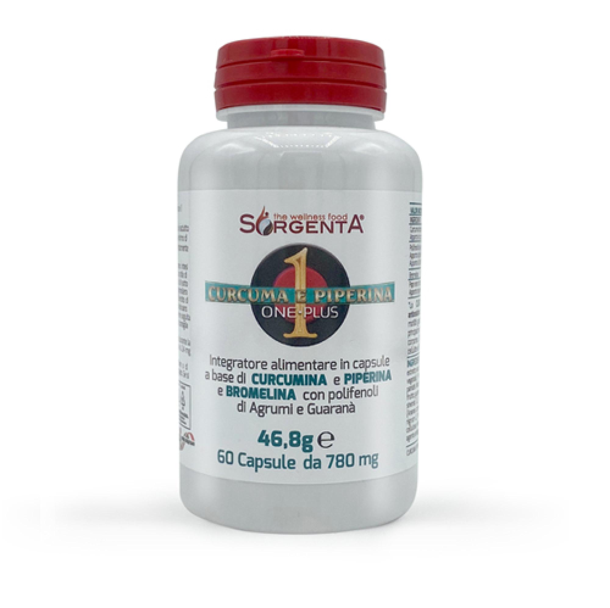 Dietary supplement in capsules based on CURCUMIN and PIPERINE and BROMELAIN with Citrus polyphenols and Guarana 46.8g 60 Capsules of 780 mg “CURCUMA AND PIPERINE ONE-PLUS has an antioxidant action. Guarana stimulates the metabolism of lipids, promoting body weight balance. Pineapple helps counteract cellulite blemishes and Grapefruit promotes drainage of body fluids.”