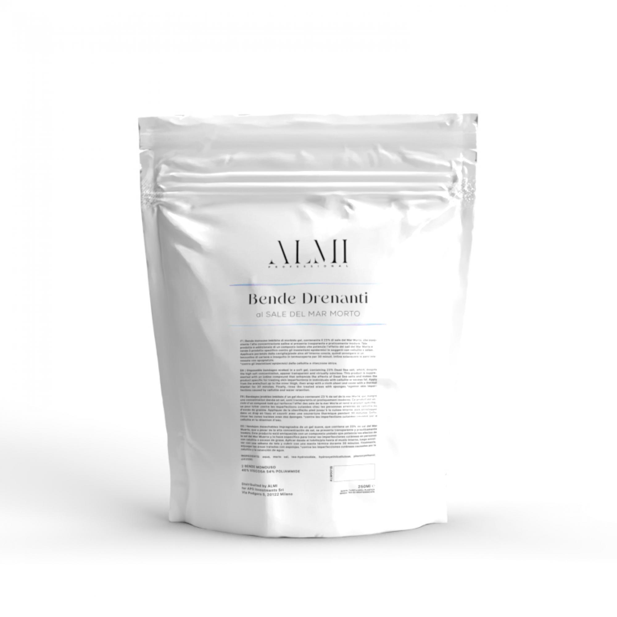 Disposable bandages soaked in soft gel, containing 23% Dead Sea salt, which, despite the high salt concentration, appears clear and virtually odorless. This product is enhanced with an iodized compound that boosts the effect of Dead Sea salts and makes the product specific against skin blemishes in subjects with cellulite or fat. Apply starting from the ankle/foot up to the inner thigh, then wrap in a cartene sheet and followed by a thermal blanket for 30 minutes. Finally, rinse the affected areas with sponging. *against skin blemishes of cellulite and water retention.